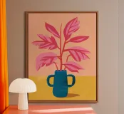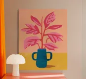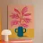 Un'illustrazione semplice ma d'effetto di una pianta dalle foglie rosa in un audace vaso blu su uno sfondo caldo, che celebra la bellezza del colore e della forma botanica minimalista.
