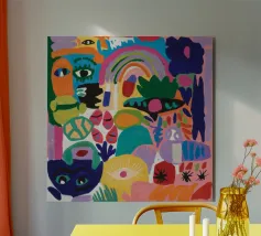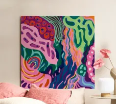 Un'opera accattivante che fonde figure umane con motivi astratti e colori vivaci. Volti e occhi sono sottilmente integrati nelle forme organiche, evocando un senso di antica saggezza e di connessione primordiale in un paesaggio surreale.