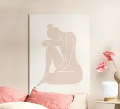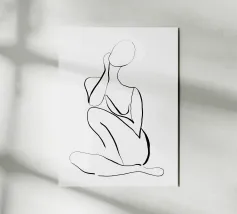 Un semplice disegno al tratto raffigura una persona seduta con i capelli ricci, le braccia avvolte intorno alle ginocchia. Lo stile minimalista utilizza linee morbide e fluide per trasmettere un senso di calma e introspezione.