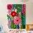 Una composizione intensamente vibrante e densa di fiori e foglie tropicali stilizzati. Rosa, rosso, verde e bianco si sovrappongono in un motivo grafico lussureggiante che evoca la sensazione di una giungla esotica e gioiosa.