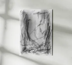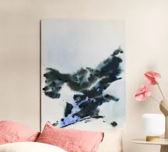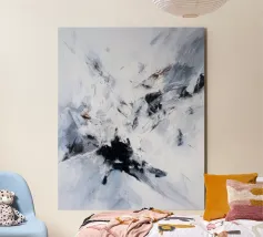 Questo dipinto astratto presenta tonalità di crema, blu e nero con molti segni intricati. Questo pezzo di lusso senza sforzo può essere il punto di riferimento perfetto per le vostre pareti o elevare istantaneamente i vostri articoli per la casa, gli accessori o l'abbigliamento.