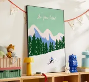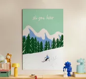 "Ski you later": un gioco di parole che unisce sport invernali e umorismo. L'illustrazione mostra uno sciatore su una pista bianca, incorniciata da abeti verde intenso e montagne color pastello. Un'immagine che cattura la leggerezza dello sci e allo stesso tempo evoca un sorriso. Perfetta per chi ama l'inverno, le montagne e il buon umore. Moderna, giocosa e un vero e proprio eye-catcher per la stagione invernale.