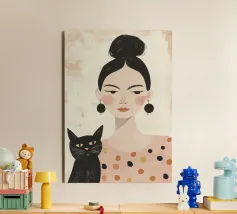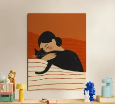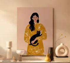 Una persona che indossa un vivace top arancione tiene vicino un elegante gatto nero, i loro sguardi sono allineati, evidenziando il forte legame tra l'uomo e l'animale domestico su uno sfondo semplice e dai toni caldi.