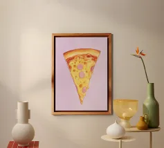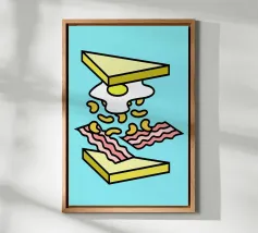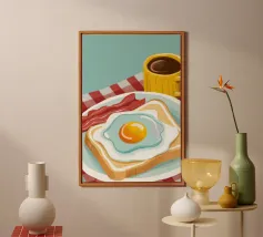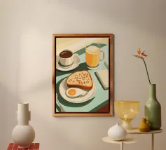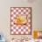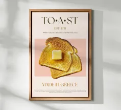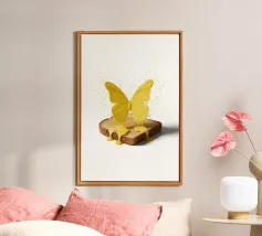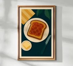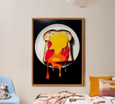 Una fetta di pane tostato è ricoperta da una generosa quantità di miele, la cui tonalità dorata contrasta con lo sfondo rosa e bianco a scacchi. La composizione, semplice ma vivace, mette in risalto la dolcezza appiccicosa del miele che brilla sotto la luce.