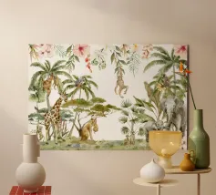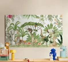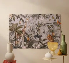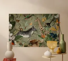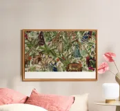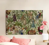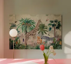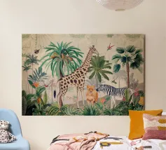 Questo incantevole disegno unisce l'eleganza vittoriana alla fantasia tropicale in una scena meravigliosamente stravagante. Graziose signore in ornati abiti d'epoca si aggirano in paesaggi lussureggianti pieni di palme e fiori esotici, interagendo giocosamente con mansueti animali selvatici. Alcune cavalcano zebre con composta dignità, altre si rilassano su divani barocchi accanto a sereni ghepardi, mentre alcune offrono dolcetti a gentili giraffe. La composizione è ricca di dettagli e deliziosamente surreale, creando un mondo vivace e pieno di affascinanti sorprese che si rivelano più a lungo si guarda.