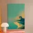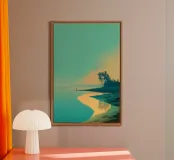 Un momento di pace catturato in un minimalismo astratto: questo paesaggio marino da sogno fonde un morbido cielo turchese con sabbie dorate, evocando una riflessione tranquilla e un profondo senso di calma. Una figura solitaria cammina lungo il bordo della serenità.
