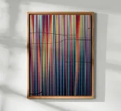 Questa suggestiva opera d'arte astratta, "Vibrant Spectrum", cattura un gioco dinamico di colori e movimento. Linee verticali di larghezza variabile in una ricca tavolozza di blu intensi, arancioni infuocati, rosa brillanti e gialli tenui creano una trama ritmica, quasi intrecciata. Audaci e gestuali tratti neri attraversano la tela, interrompendo le linee ordinate e aggiungendo un elemento di energia grezza e spontaneità. Questo pezzo è una dichiarazione moderna e sofisticata, perfetta per aggiungere un tocco di colore e interesse visivo a qualsiasi spazio abitativo contemporaneo, ufficio o parete della galleria.