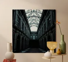 Un intricato edificio abbandonato presenta archi ornati e stratificazioni labirintiche con texture in decadenza sotto una luce naturale diffusa. Il design simmetrico e i dettagli rovinati dalle intemperie evocano mistero e profondità storica in questo ambiente architettonico surreale.
