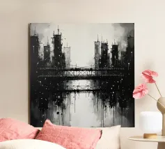 Una composizione surreale in bianco e nero con un'imponente struttura architettonica di ispirazione gotica circondata da acque ferme sotto una forte pioggia. L'illuminazione drammatica e il design intricato evocano un'atmosfera di struggente bellezza.