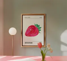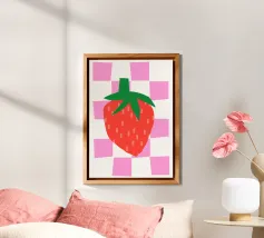 Una pila di tre fette di pane tostato con sopra un generoso strato di marmellata rossa brillante si trova su uno sfondo a scacchi bianchi e rosa. La rappresentazione realistica del pane contrasta con lo sfondo geometrico e giocoso.