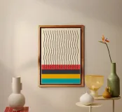 Questo vibrante poster astratto cattura l'essenza del Mid-Century Modern e del design grafico contemporaneo. La sezione superiore presenta una serie di delicate linee nere ondulate disegnate a mano su uno sfondo bianco sporco, creando un senso di movimento e consistenza. In basso, la composizione è ancorata da blocchi di colore di un rosso intenso con un bordo inferiore frastagliato, grigio antracite, giallo senape e un brillante blu verde acqua. Questo pezzo giocoso ma sofisticato è perfetto per aggiungere un tocco di colore e di fascino retrò a qualsiasi spazio abitativo. Consegnato come file digitale di qualità superiore a 7000x5000 pixel, 300 dpi, per un'ottima qualità di stampa.