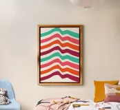 Un poster digitale Op Art e retrofuturistico che presenta linee ondulate orizzontali in una vibrante tavolozza Mid-Century Modern. I colori - verde acqua, rosa caldo, arancione brillante e bordeaux intenso - sono separati da sottili strisce bianche, creando un senso dinamico di profondità e movimento, quasi come un paesaggio desertico colorato o le onde sonore. Questo design vivace aggiunge un immediato tocco vintage e un divertimento massimalista a qualsiasi spazio. Questo download digitale di alta qualità vanta 7000x5000 pixel a 300 dpi, garantendo una chiarezza eccezionale e una qualità di stampa superiore per l'arte di grande formato.