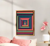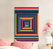 Uno straordinario poster astratto che crea un'ipnotica illusione ottica di profondità infinita, spesso definita "tunnel quadrato". Il disegno è caratterizzato da quadrati concentrici che sembrano ritirarsi verso l'interno, resi in un'audace tavolozza di colori di ispirazione retrò e degradati: rosa caldo, giallo senape, verde acqua intenso e viola prugna. L'alternanza delle bande di colore e la geometria precisa conferiscono al pezzo un effetto 3D dinamico, caratteristico della grafica Op Art e Mid-Century Modern. La sottile texture grunge esalta l'estetica vintage. Questo download digitale ad alta risoluzione (7000x5000 pixel, 300 dpi) assicura un'ottima qualità di stampa.