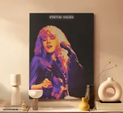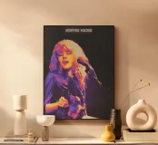Stevie Nicks canta appassionatamente sul palco sotto una suggestiva illuminazione viola e arancione.