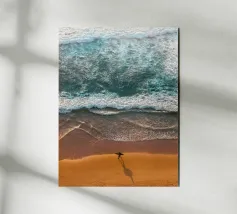 Questa stampa artistica sulla spiaggia cattura una prospettiva aerea di una persona che cammina mano nella mano con il suo cane lungo un tratto di sabbia incontaminato. La luce soffusa del sole immerge la scena in una calda luminosità, esaltando i disegni naturali della sabbia e proiettando ombre allungate. Le dolci onde lambiscono ritmicamente la riva, creando un delicato contrasto tra l'acqua azzurra e la spiaggia color crema. La composizione armoniosa e la gradazione di colori tenui evocano la compagnia, l'avventura e la riflessione pacifica. Perfetto per uffici, soggiorni o spazi di ritiro che celebrano la connessione e la tranquillità costiera.