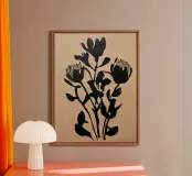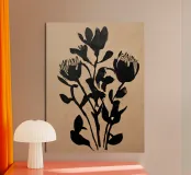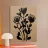 Un'audace silhouette floreale in nero profondo su un caldo sfondo beige. Gli steli, le foglie e i fiori sono resi in netto contrasto, catturando l'eleganza della natura attraverso una forma semplificata. Questa composizione minimale enfatizza la texture, l'ombra e l'equilibrio, fondendo la bellezza botanica con un design grafico moderno.