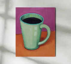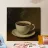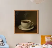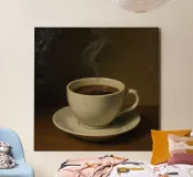 Tazza da caffè con vapore appoggiata su un piattino in un ambiente caldo alluminio dibond