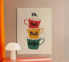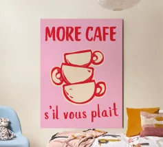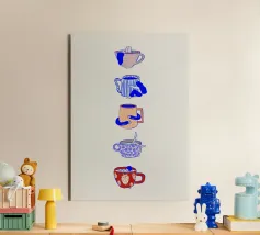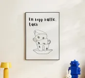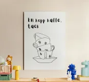 Diverse tazze di caffè sono giocosamente impilate l'una dentro l'altra e formano un motivo armonioso e minimalista. Compare anche la scritta svedese "en kopp kaffe, tack" ("una tazza di caffè, per favore"). La combinazione è calda, invitante e tipicamente scandinava.