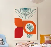 Questo accattivante poster presenta un elegante design astratto in stile Mid-Century Modern con forme geometriche arrotondate che ricordano forme floreali retrò in una calda tavolozza di arancione brillante e rosso intenso. Un audace motivo a raggiera verde acqua si irradia dalla parte superiore, fornendo un contrasto fresco. La composizione comprende archi concentrici di colore verde acqua integrati nelle forme arancioni, che aggiungono movimento e dettagli. Il pezzo è pulito e vivace su uno sfondo color crema. Questo poster digitale di qualità superiore viene fornito a 7000x5000 pixel, 300 dpi, garantendo una riproduzione di alta qualità e l'eccellenza artistica. Tags :