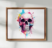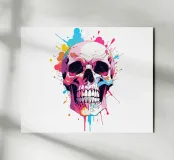Un'impressionante illustrazione di un teschio con un'esplosione di vibranti spruzzi d'inchiostro sullo sfondo. Questo design audace fonde vibrazioni gotiche e taglienti con l'energia della moderna street art. Perfetto per chi ama un'estetica oscura ma colorata.