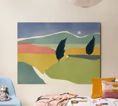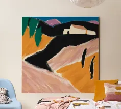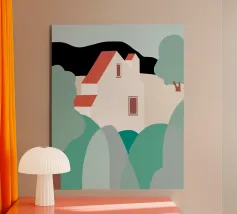Una scena di spiaggia minimalista è rappresentata con forme geometriche decise e una tavolozza di colori limitata. Una barca a vela è parzialmente visibile dietro una duna di sabbia, mentre il mare tranquillo è affiancato da un fogliame scuro e semplificato.