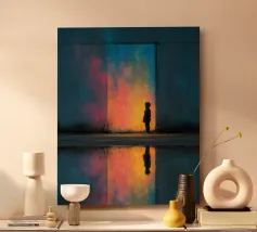 Questa suggestiva opera d'arte cattura la silhouette di una figura solitaria in piedi in un portale luminoso, che guarda in un cosmo vorticoso di colori vibranti e marmorizzati. Le fluide transizioni di blu, viola e gialli tenui evocano un senso di introspezione e trascendenza. La composizione suggerisce un portale tra il mondo interiore e l'ignoto, una rappresentazione poetica dell'immaginazione, della speranza e del potere tranquillo della solitudine. Le texture sognanti e pittoriche aggiungono profondità e movimento, invitando gli spettatori a entrare nel proprio spazio contemplativo.