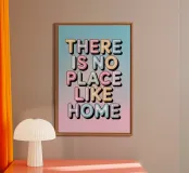 Le scritte colorate e audaci "The Front" e "There Is No Place Like Home" in una tipografia retrò e vintage. Le lettere colorate e vivaci su uno sfondo semplice creano un disegno vettoriale giocoso, pulito ed elegante.