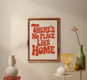 La scritta "There's No Place Like Home" appare in grandi lettere rosse su uno sfondo beige chiaro. La tipografia giocosa e leggermente irregolare conferisce al design calore e carattere.