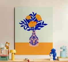 Illustrazione minimalista ed elegante di una mano blu scuro che dispone delicati fiori e foglie rosa in un vaso viola.