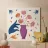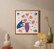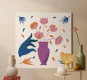 Illustrazione minimalista ed elegante di una mano blu scuro che dispone delicati fiori e foglie rosa in un vaso viola.