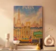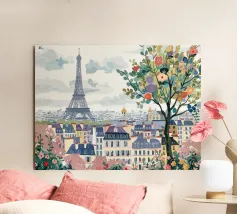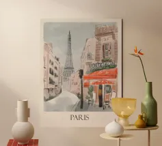 Catturate il fascino romantico di Parigi con questa elegante stampa acquerellata. L'opera presenta una classica scena di strada parigina con la Torre Eiffel sullo sfondo, incorniciata da una vegetazione lussureggiante e da edifici iconici in stile Haussmann. Un lampione d'epoca, dettagli di balconi in ferro e una bicicletta verde aggiungono un tocco nostalgico e poetico alla composizione. Dipinta in uno stile stravagante e illustrativo, questa stampa dona calore e carattere a qualsiasi spazio. Perfetta per gli amanti dei viaggi, dell'architettura e del fascino europeo, questa opera è ideale per l'arredamento della casa, per le pareti dell'ufficio o per gli angoli creativi che necessitano di un'attenzione particolare.