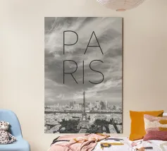 Il famoso simbolo di Parigi, la Torre Eiffel, in un design molto moderno. Lavoro artistico con elementi tipografici.