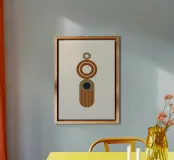 Una composizione astratta sofisticata e mirata, caratterizzata da forme geometriche impilate verticalmente su uno sfondo caldo e bianco sporco. L'opera d'arte ricorda un orecchino o un amuleto stilizzato e sovradimensionato. La sezione superiore è costituita da due anelli concentrici in terracotta profonda/arancio bruciato. La sezione inferiore, allungata, presenta estremità arrotondate, un colore marrone moka, un piccolo cerchio blu scuro e strisce verticali in terracotta. Il design fonde perfettamente la semplicità del Mid-Century Modern con un'estetica boho-chic contemporanea. Questo download digitale di alta qualità (7000x5000 pixel, 300 dpi) garantisce una qualità di stampa eccezionale, offrendo un'ottima qualità di stampa.