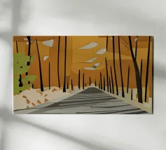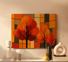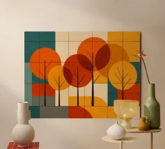 Una splendida rappresentazione astratta di una foresta autunnale con alti tronchi scuri e fogliame dorato. Lo sfondo caldo e luminoso esalta la composizione geometrica, creando un'atmosfera serena e moderna.