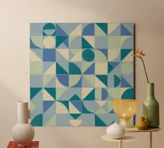 Le forme geometriche sono disposte su uno sfondo strutturato, caratterizzato da un motivo a griglia verde acqua. I triangoli di varie tonalità creano un contrasto visivo dinamico.