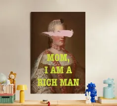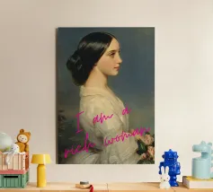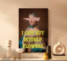 Prendete un impegno con un tocco spiritoso con "I Am Yours No Refunds". Questa accattivante stampa pop art fonde magistralmente un'affascinante scena classica con una dichiarazione contemporanea e umoristica. Presenta una figura storica elegantemente vestita, che tende graziosamente la mano accanto a un sereno specchio d'acqua, con un cesto di fiori e un cagnolino ai suoi piedi. Il testo in grassetto, di colore rosa caldo, "I AM YOURS NO REFUNDS", sovrasta l'immagine, trasformando l'ambientazione romantica in una dichiarazione giocosa ma decisa. Perfetto per aggiungere personalità e un tocco di fascino spensierato a qualsiasi spazio contemporaneo. Realizzato ad un prezzo eccezionale
