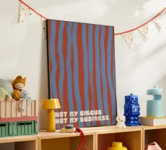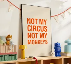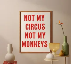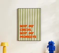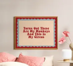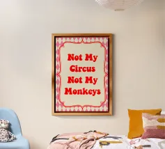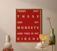 Stampa umoristica con lo slogan "A quanto pare queste sono le mie scimmie e questo è il mio circo" - testo nero su sfondo a righe bianche e rosse. Perfetto come regalo divertente, decorazione murale per l'ufficio o la casa. Ideale per gli appassionati di sarcasmo e caos.