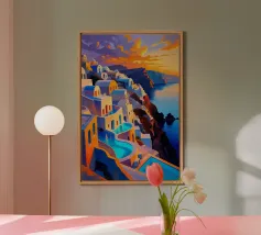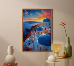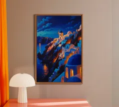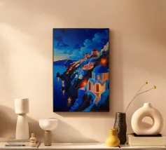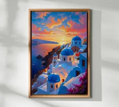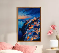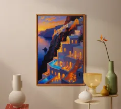 Twilight Glow Over Santorini's Clifftop Architecture alluminio dibond con Cornice Artbox