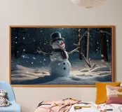 Un pupazzo di neve, con tanto di cappello a cilindro e sciarpa, saluta la sera d'inverno in una foresta serena. I fiocchi di neve cadono delicatamente intorno, creando un'atmosfera magica.