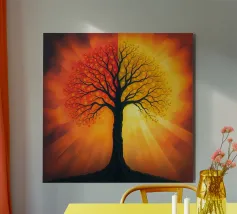 Questo affascinante dipinto a olio presenta una drammatica interpretazione astratta di un albero inghiottito da fiamme vibranti. La ricca tecnica di impasto crea un incredibile senso di consistenza e movimento, con spesse pennellate di arancioni, rossi e gialli infuocati che formano la chioma incandescente dell'albero. Il tronco e le radici scure e nodose ancorano l'inferno a un cielo cupo e tempestoso, reso con blu profondi, grigi e accenni di un minaccioso bagliore arancione all'orizzonte. Questo pezzo evoca potenti emozioni di passione, distruzione e resilienza, rendendolo un'aggiunta davvero unica e sorprendente a qualsiasi collezione d'arte.