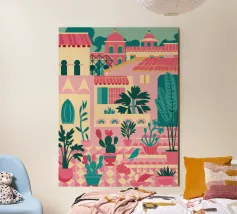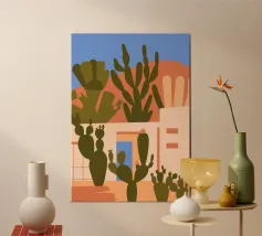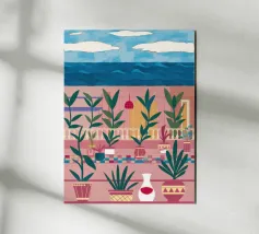 Questo disegno porta in casa vostra la gioia di vivere mediterranea e la leggerezza estiva. L'illustrazione colorata mostra un vivace patio pieno di piante fiorite e cactus in vasi eleganti, circondati da colori caldi e terrosi. L'aspetto moderno e disegnato a mano e l'armoniosa composizione cromatica di rosa, giallo, blu e verde rendono il motivo un richiamo visivo ideale per murales, tazze, cuscini e molto altro. Perfetto per gli amanti delle piante che desiderano portare la natura e il colore nei loro spazi abitativi. Un'attrazione per ogni casa o un regalo creativo.