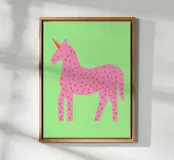 Questa giocosa illustrazione mostra un unicorno rosa con puntini su uno sfondo arancione e verde, perfetto per le camere dei bambini o per le decorazioni estive. La grafica dipinta a mano combina elementi fantasiosi con un design minimalista e crea un'atmosfera allegra che irradia gioia e creatività.
