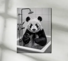 Un simpatico panda si gode la pioggia in piedi in una pozzanghera alluminio dibond