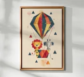 In volo su un pallone patchwork, un allegro leone e un gentile elefante iniziano il loro safari in cielo. Questa giocosa illustrazione combina il fascino geometrico con l'estrosità dei libri di fiabe, perfetta per gli spazi dei bambini, le camerette e i giovani sognatori. Una celebrazione dell'amicizia, dell'avventura e dell'immaginazione, avvolta in forme audaci e colori caldi.