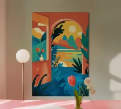 Una composizione minimalista presenta un vaso con una pianta verde davanti a una finestra ad arco, che mostra un paesaggio sereno con montagne, sole e lago in toni tenui. Le calde tonalità del marrone e del rosa creano un'atmosfera naturale e rilassante.