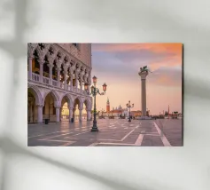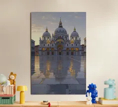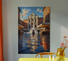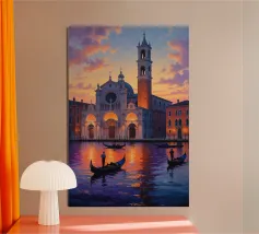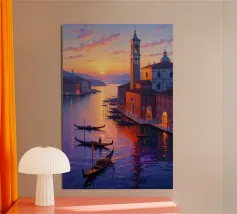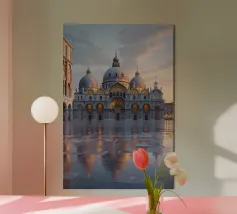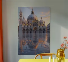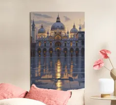 Questo dipinto iperrealistico mozzafiato ritrae la bellezza senza tempo di Venezia di notte, con archi luminosi, eleganti architetture rinascimentali e strade di ciottoli bagnate che riflettono luci dorate. La profondità dei dettagli delle finestre illuminate e delle intricate statue sui tetti esalta la grandezza di Piazza San Marco. Il cielo notturno blu scuro, disseminato di stelle, contrasta meravigliosamente con la luce calda, creando un'affascinante atmosfera da sogno. Ideale per gli amanti del fascino classico europeo, dell'eleganza storica e dei paesaggi urbani coinvolgenti.