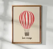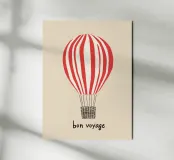 Il motivo mostra la scritta "Bon Voyage" sotto una mongolfiera a strisce bianche e rosse. Il design minimalista su sfondo beige ricorda i poster di viaggio francesi e irradia leggerezza e senso di avventura. Un murale moderno e affascinante per tutti coloro che amano i viaggi e l'avventura.