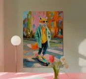 Dipinto a olio di una volpe antropomorfa con occhiali da sole e giacca color pastello, in piedi su uno skateboard colorato per strada. Colori vivaci in rosa, arancione, verde, blu e giallo, pennellate decise ed estetica vintage creano una scena giocosa e amichevole nel ritratto a figura intera.
