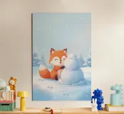 Con un sorriso giocoso, Voxy modella una piccola scultura di neve in una foresta innevata. Il blu tenue, la delicata nevicata e la simpatica energia invernale ne fanno un'illustrazione perfetta per i bambini e gli amanti delle vacanze.