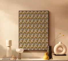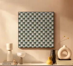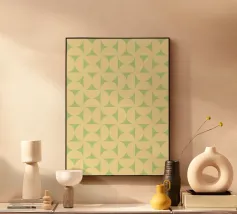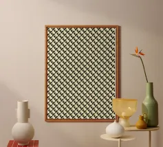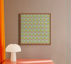 Questo elegante disegno rotondo è caratterizzato da elementi fluidi e ondulati che creano un senso di movimento e armonia. Reso in una rilassante combinazione di verde e beige pastello, l'opera d'arte è moderna e senza tempo. Le linee organiche e ondulate conferiscono al disegno un ritmo delicato, rendendolo una scelta perfetta per tessuti, decorazioni per la casa o articoli di cancelleria. La sua composizione circolare aggiunge una sensazione di equilibrio e centralità, ideale per chi ama il design astratto e fluido con una palette di colori sofisticata.